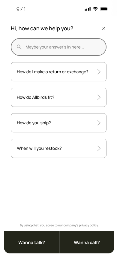 Iteration: The CTA icon for scheduling a call was replaced with an avatar to represent the chatbot, and users were given options to either set up a call or chat, making the action more explicit.