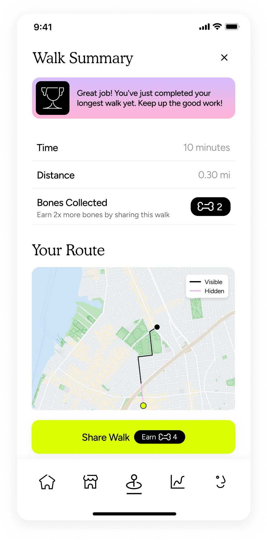 Introduce more milestones for users to achieve together and share with friends. For example, a walking challenge could motivate users to complete a set number of walks that can be shared in the feed with other users.