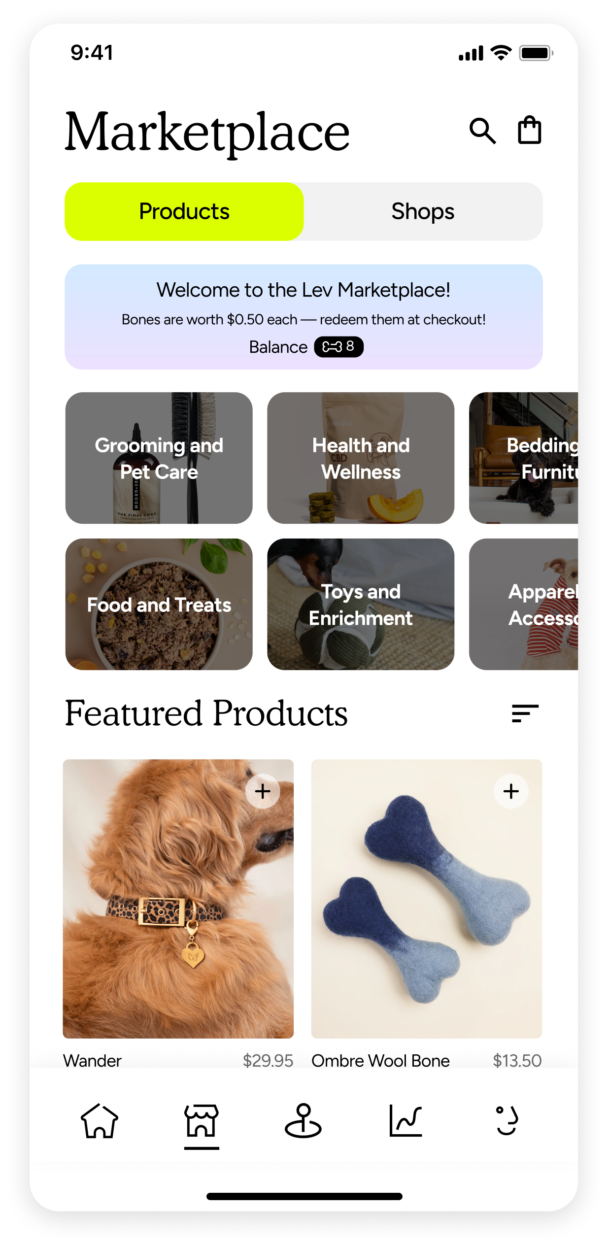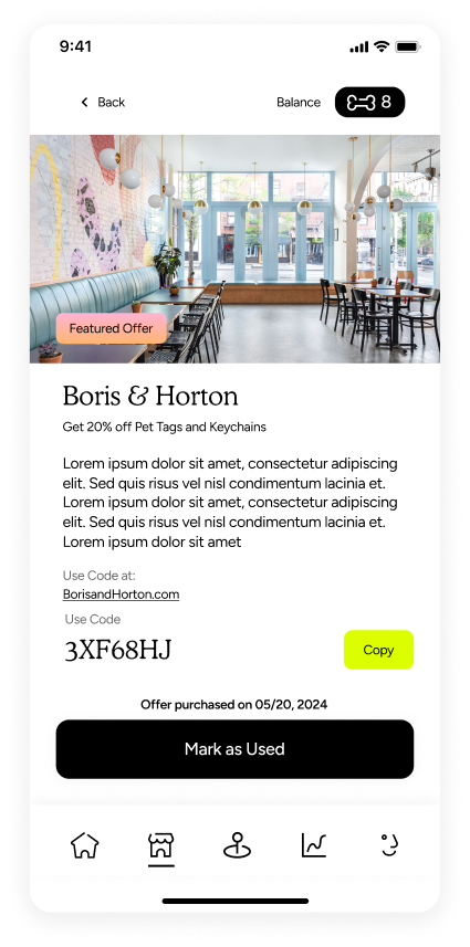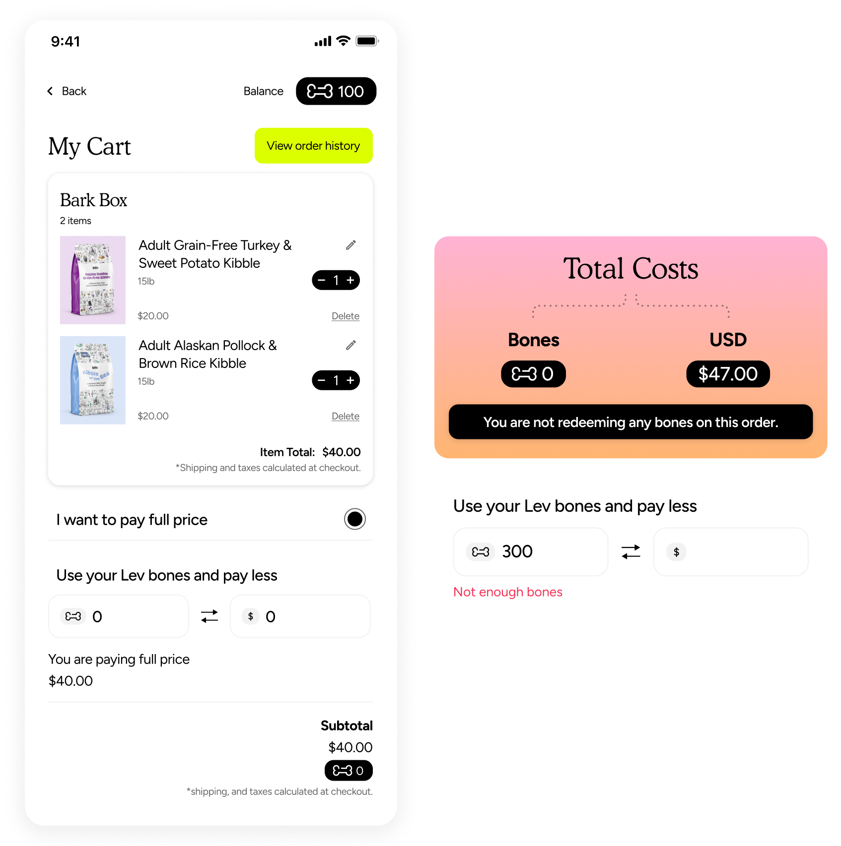 The goal of this redesign was to replace discount codes with a rewards currency, known as ‘bones’ that Lev members can apply toward their total purchase. To prevent losses, we dynamically adjust the bones-to-currency exchange rate based on user data, ensuring redemptions don’t exceed our commission earnings from marketplace stores.
